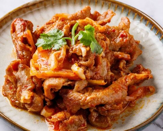 - 主角回鍋,大火收汁: 把剛剛盛起的豬肉片(連同流出的肉汁)倒回鍋裡,轉大火!快速翻炒,讓泡菜醬汁緊緊巴住每一片豬肉。這時鍋氣很足,動作要快!試一下味道,此時如果覺得不夠鹹才補一點點醬油(因為泡菜和醃肉都有鹹度),需要更辣可以加點辣椒粉。喜歡吃洋蔥軟甜口感的,這時可以加洋蔥絲一起炒軟。