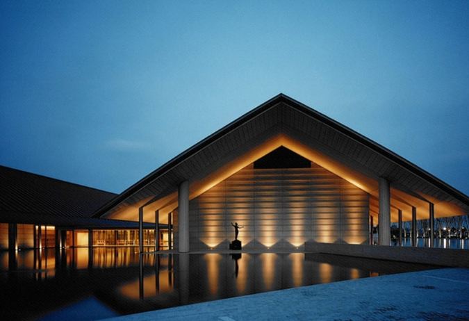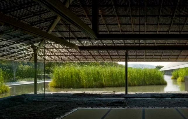 走進佐川美術館,你會立刻被那份寧靜包圍。建築師榊田倫之的設計太絕了——大片水池環繞著簡約現代的館體,光影在水面、玻璃和牆壁之間跳舞,營造出虛實交錯的幻境。這種「水鏡」設計,讓建築彷彿消融於自然,你根本分不清哪裡是實體,哪裡是倒影。這種安靜而強大的存在感,讓浮躁的心也跟著沉澱下來。