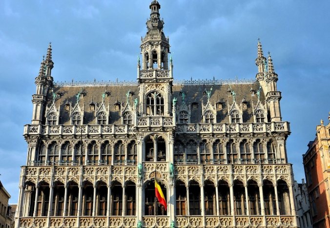 嚴格來說,布魯塞爾大廣場 根本就是一座露天的建築博物館!這裡不是隻有一塊空蕩蕩的地,而是被眾多極盡奢華之能事的歷史建築緊緊包圍著。想像一下:腳下是古老的花崗岩與石灰岩鋪就的地面,抬頭是令人目不暇給的金色雕像、精雕細琢的山牆、飄揚的旗幟。整個廣場的核心,毫無疑問是那座氣勢磅礡的布魯塞爾市政廳(Hôtel de Ville)。它那高達96公尺的尖塔,簡直就是廣場的天際線指揮官!老實說,站在塔下往上望,脖子真的會痠,但那份精緻的哥德式雕工,絕對值得你仰頭欣賞三分鐘。市政廳不對稱的立面設計(左邊比右邊多開了一個拱門)一直是個歷史謎團,有人說是設計師失足墜塔來不及完成,也有人說是故意為之 – 哪個故事是真的?留給你自己去考證囉!市政廳是可以入內參觀的(有導覽團),內部華麗的會議廳和掛毯絕對讓你驚呼「哇賽」!